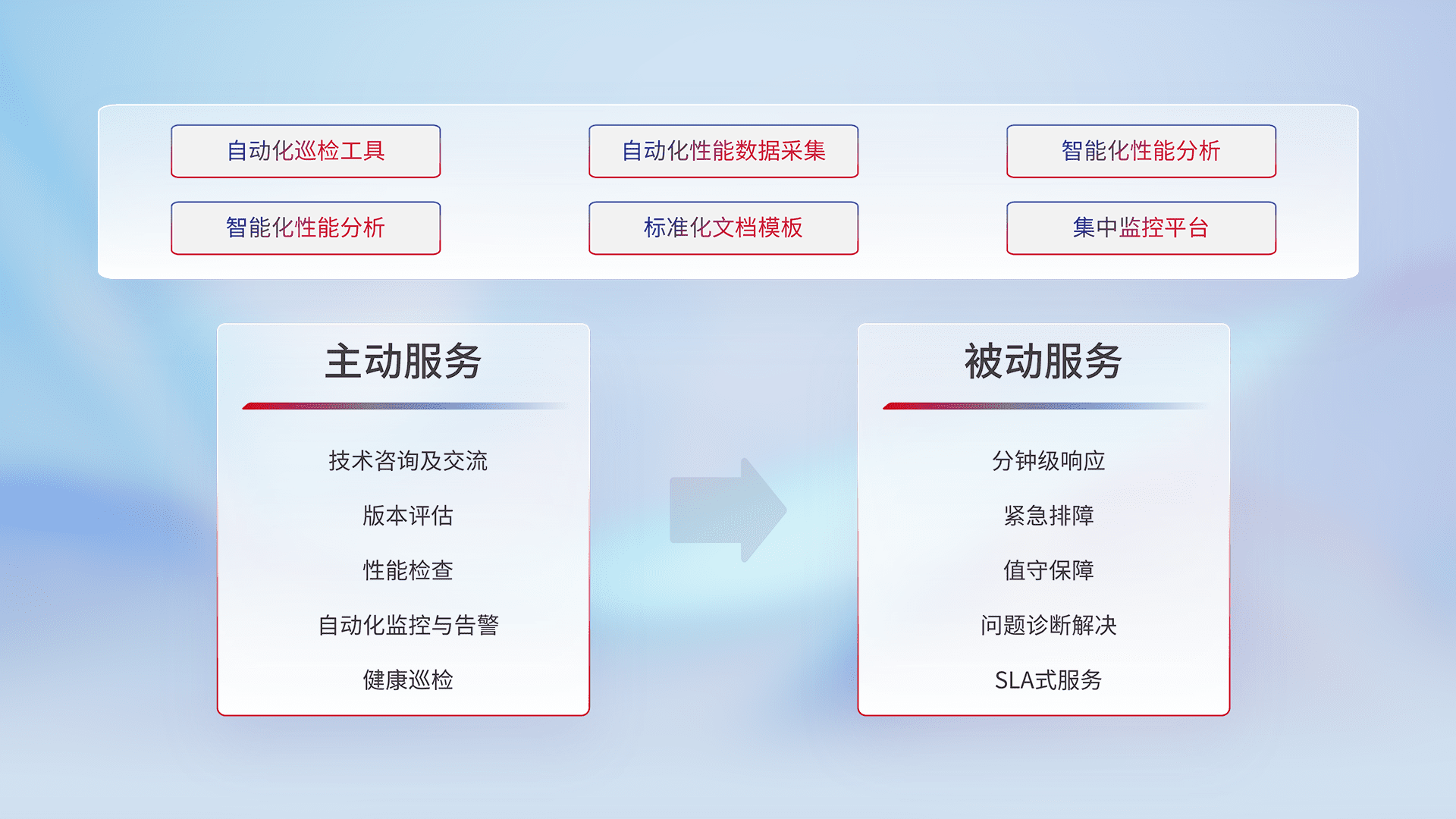 智能化工具和标准化文档,,,,保障服务质量,,,提供主动服务(包含技术咨询、、版本评估、、、性能检查、、、、自动化监控与告警、、健康巡检)和被动服务包含(分钟级响应、、、、紧急排障、、值守保障、、、问题诊断解决、、、、SLA服务)。。。。
