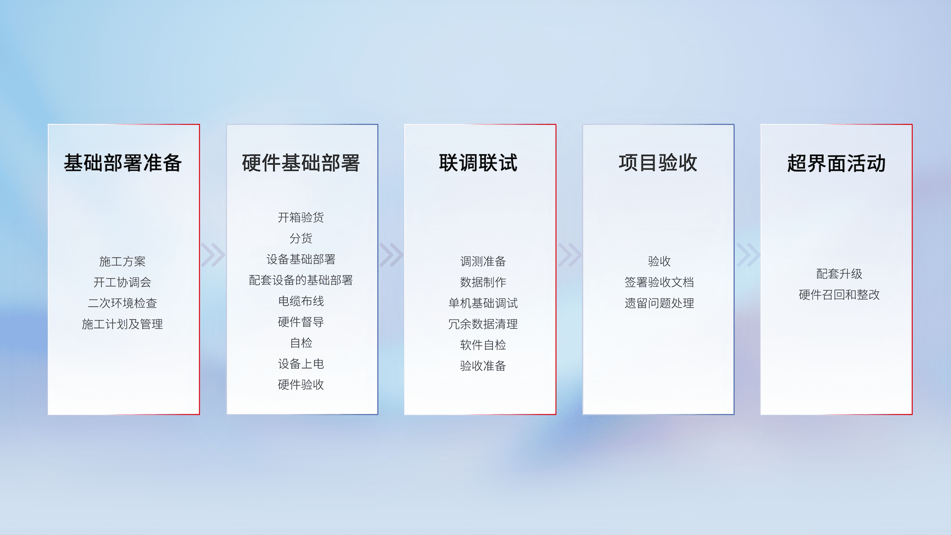 从基础部署准备、、硬件基础部署、、、、联调联试、、、项目验收、、、越界面活动的全过程可追溯,,,保证施工质量和进度。。。。