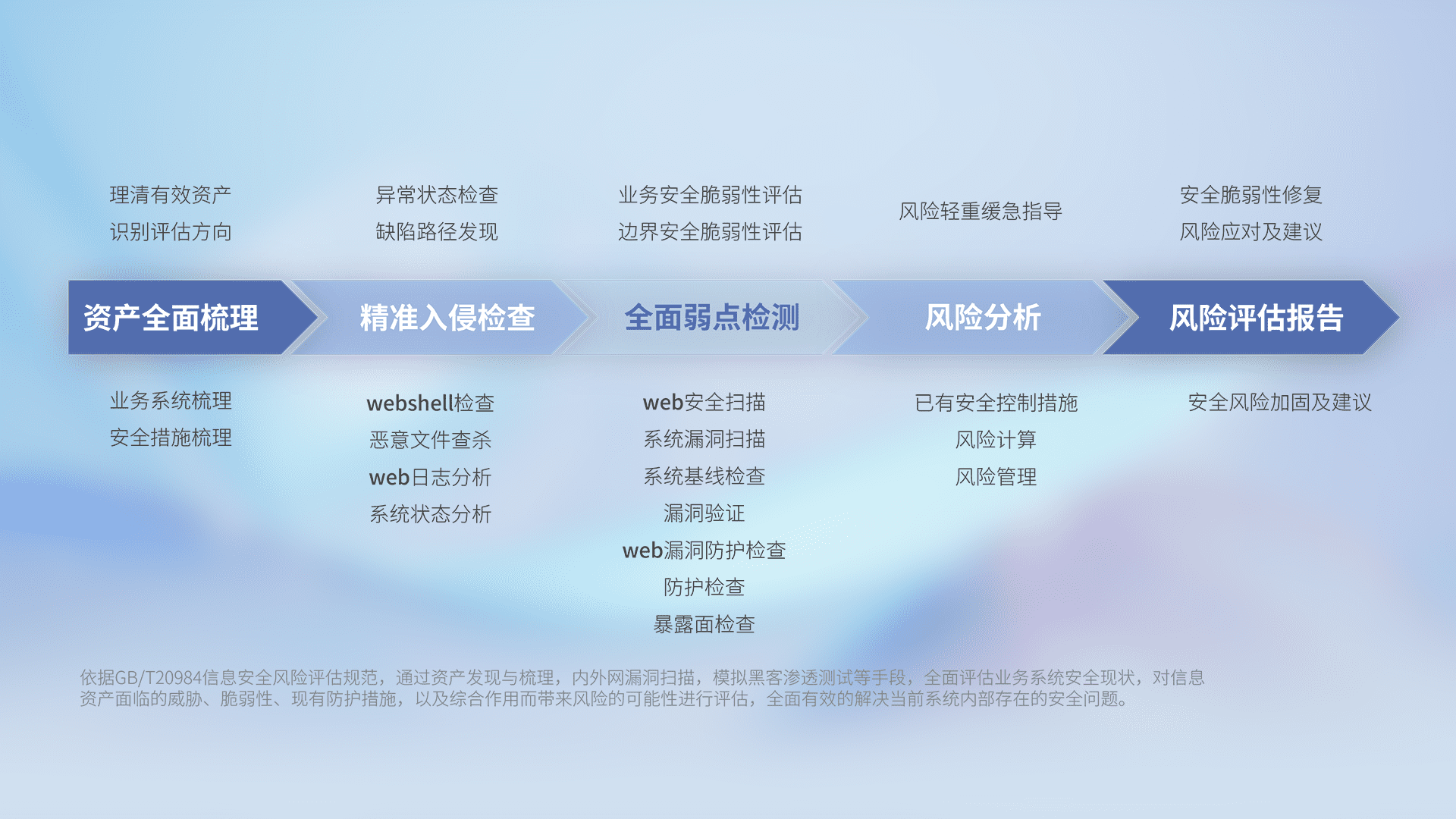 针对客户行业特性,,,以专业的安全服务+多厂商联合解决方案提供专属的一站式安全管理服务,,,,帮助客户全面感知网络空间威胁,,,,基于识别、、检测、、、分析、、防护、、、监测、、、、响应的服务理论模型,,从方案咨询、、、集成交付、、评估验证、、、优化加固、、、运维运营,,,致力于为客户提供完整的闭环管理式安全服务。。。。以实战经验为客户打造高抵御风险的安全体系,,帮助客户发现威胁、、、对抗威胁、、、处置威胁,,,不断积累安全对抗能力,,持续保障数字化安全。。。。